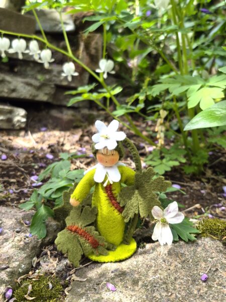Juist die eenvoud en zachtheid maakten het bosanemoontje ooit de inspiratie voor een vilten bloemenkindje. Het originele voorbeeld heeft inmiddels een eigen weg gevonden na een beurs (zoals dat soms gaat), maar gelukkig blijven mooie ideeën bestaan.