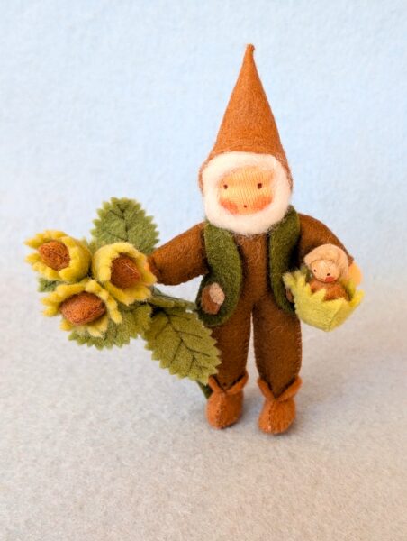 Onder de hazelnootbomen bouwt de Hazelnootkabouter aan zijn wintervoorraad hazelnoten. Hij is ongeveer 14 cm groot en houdt de eerste hazelnoten trots in zijn hand. In zijn andere arm draagt hij een lief hazelnootbaby’tje, veilig en knus. Een sfeervol ontwerp dat perfect past bij de herfst en de seizoenstafel. Met zijn warme kleuren en liefdevolle details brengt hij de bosmagie tot leven. Verkrijgbaar als patroon en als viltpakket.