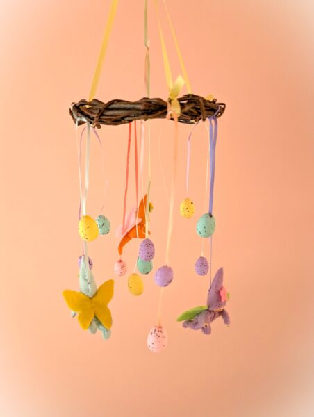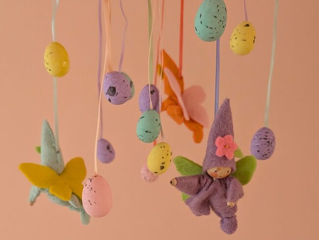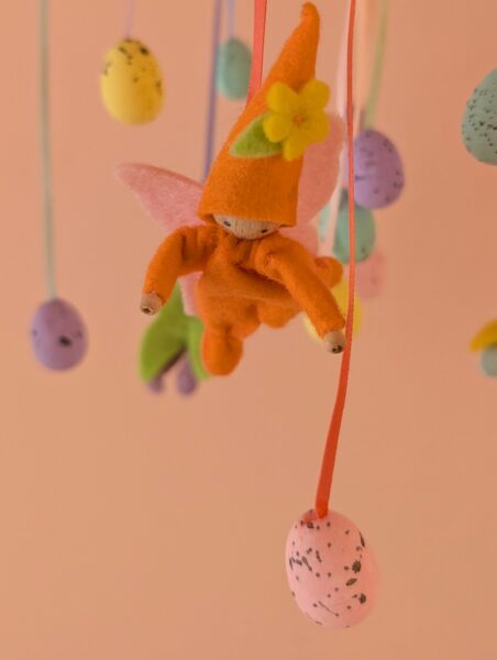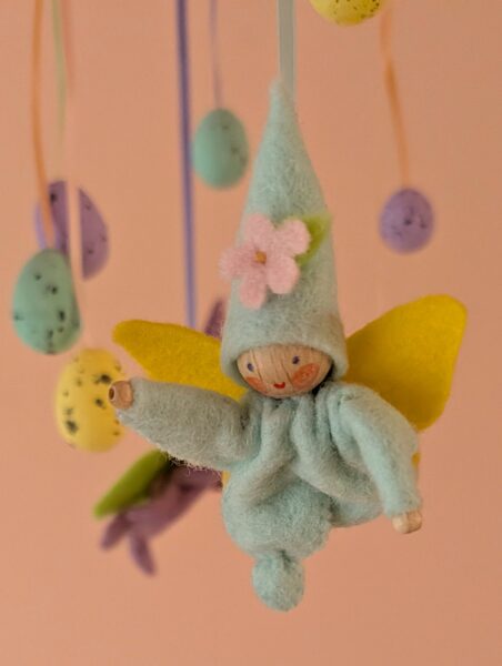 Eerst was daar de Paaskabouter die dinsdag uitkwam. Omdat ik zo van die zachte, zoete kleurtjes hou, heb ik daarna nog wat extra kaboutertjes gemaakt. Je kunt ze natuurlijk in een paastak hangen, maar ik maakte een krans van wilgentenen en hing ze daar met lintjes en kleine eitjes aan. Het staat zo gezellig!
