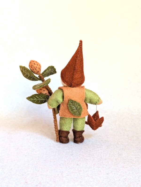Diep verscholen tussen de beukenbomen woont de Beukennootkabouter. Hij is ongeveer 14 cm groot en draagt een takje met bolsters bij zich. In zijn hand houdt hij een lief beukennootkindje en zijn jasje is versierd met kleine beukennootjes. De warme tinten en natuurlijke details brengen het bos tot leven in huis. Een prachtig ontwerp voor de herfstseizoentafel, verkrijgbaar als patroon én als viltpakket.