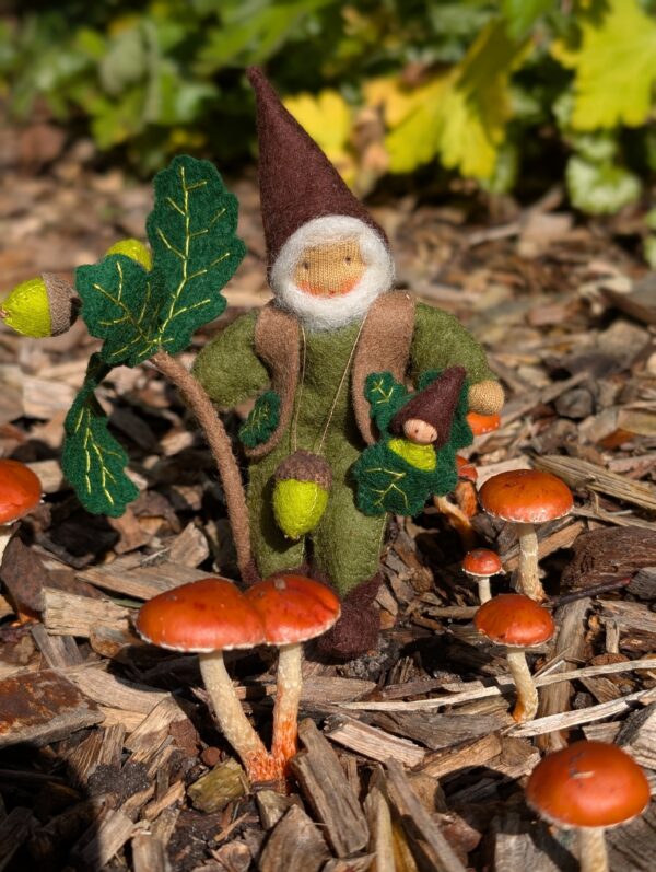 Ontmoet deze leuke eikelkabouter van 14 cm groot die rechtstreeks uit het bos lijkt te komen. Waarschijnlijk heeft hij zijn huisje ook onder een eikelboom gebouwd want hij heeft een eikentak met eikels in zijn hand en hij draagt een eikelketting. In zijn arm draagt hij een lief kindje dat veilig in een eikenbladbedje ligt.