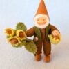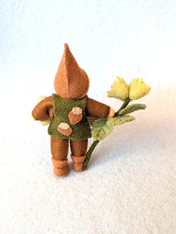 Onder de hazelnootbomen bouwt de Hazelnootkabouter aan zijn wintervoorraad hazelnoten. Hij is ongeveer 14 cm groot en houdt de eerste hazelnoten trots in zijn hand. In zijn andere arm draagt hij een lief hazelnootbaby’tje, veilig en knus. Een sfeervol ontwerp dat perfect past bij de herfst en de seizoenstafel. Met zijn warme kleuren en liefdevolle details brengt hij de bosmagie tot leven. Verkrijgbaar als patroon en als viltpakket.