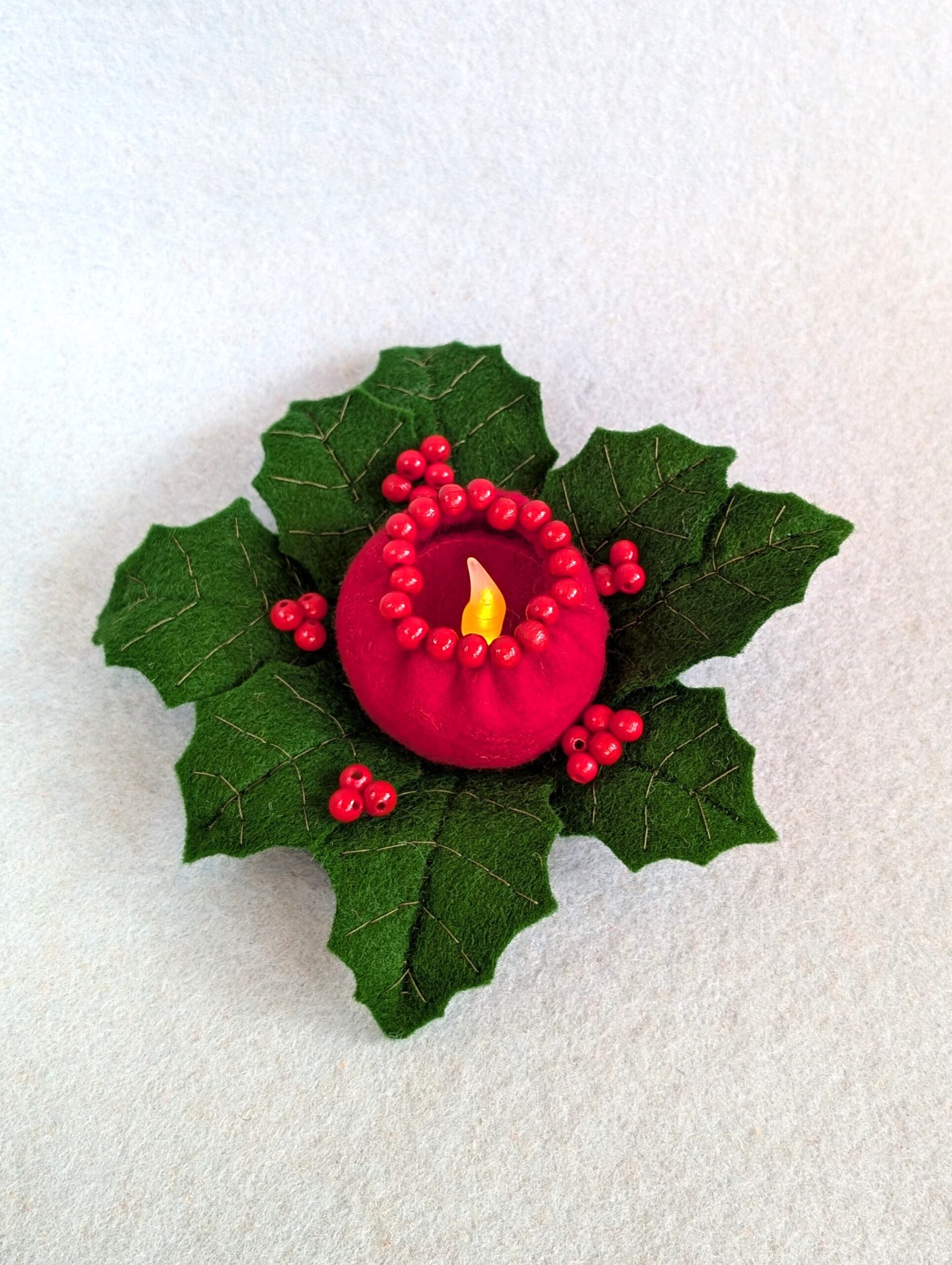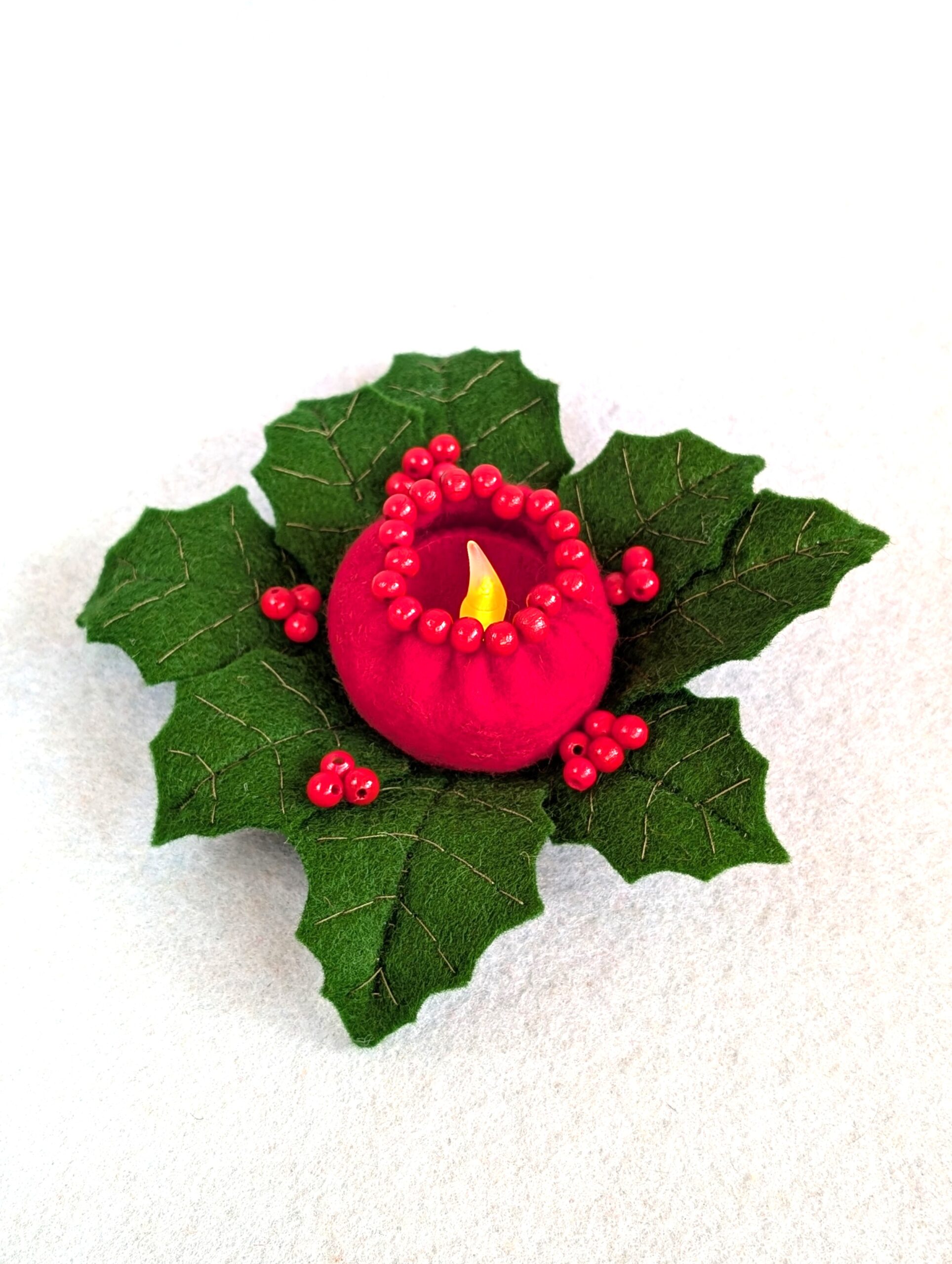 Breng licht en vrolijkheid in de donkere decemberdagen met het betoverende Hulst Lichtje van Atelier Pippilotta. Dit lieflijke tafereeltje is met zorg vervaardigd uit stevig wolvilt en versierd met rode houten kralen. In het midden brandt een veilig led-waxinelichtje op batterijen, waardoor je het Hulst Lichtje met een gerust hart kunt laten schijnen. Perfect voor op de seizoenstafel, de vensterbank of op de kersttafel. Als variatie kun je het lichtje ophangen met satijnlintjes die ook in het complete hobbypakket zitten.. Als hanglampje boven je seizoenstafel of voor het raam brengt het net zo veel sfeer.