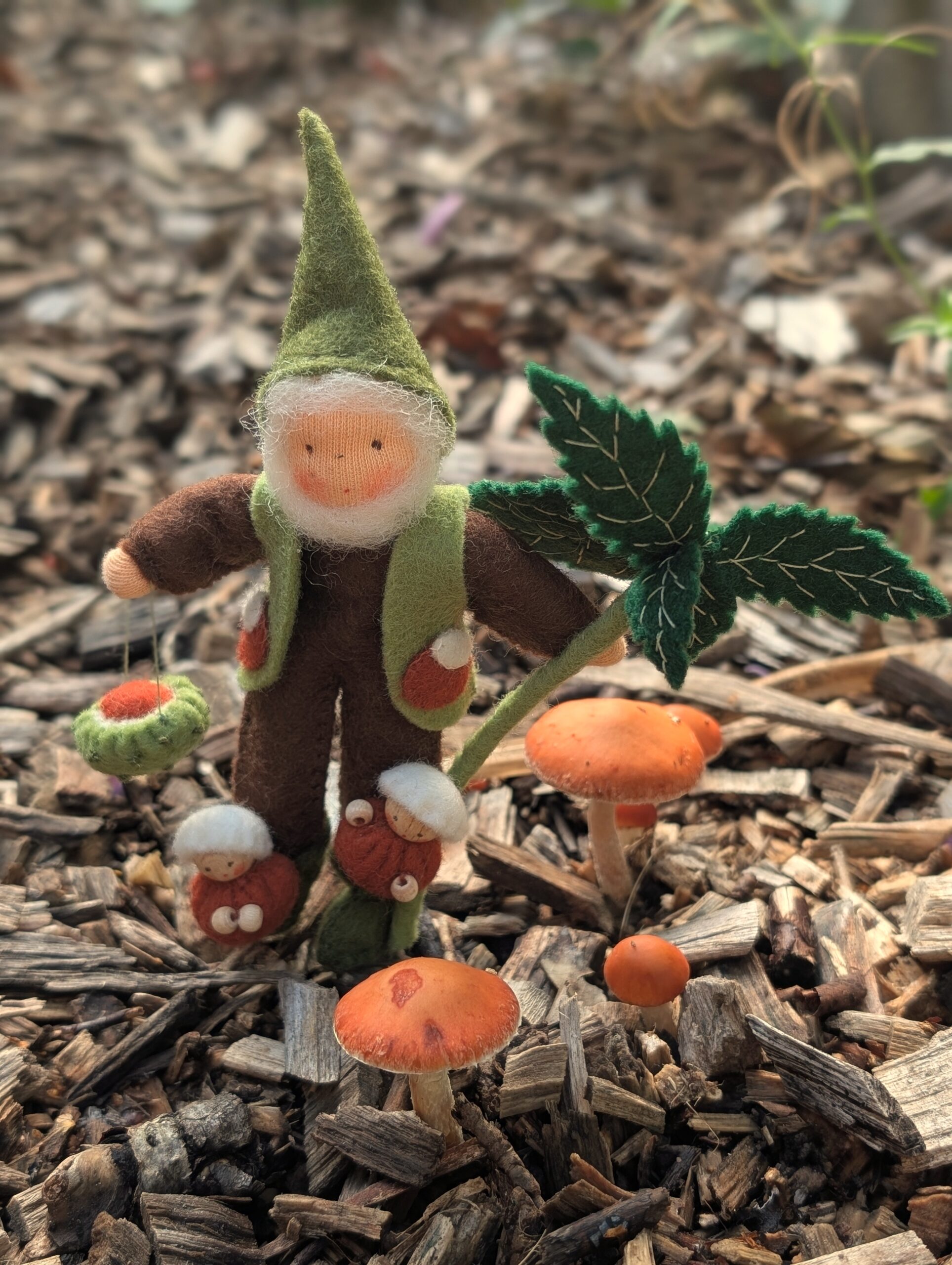De Kastanjekabouter van Atelier Pippilotta woont in het grote bos en is ongeveer 14 cm groot. In zijn hand houdt hij een kastanjetak, en in de andere hand draagt hij een bolster met een glanzende kastanje. Aan zijn voeten liggen twee lieve kastanjekindjes die hem vrolijk gezelschap houden. Een sfeervol ontwerp dat perfect past bij de herfst en de seizoentafel. De warme kleuren en natuurlijke details brengen het bos tot leven in huis.