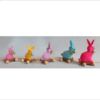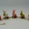 Een vrolijk treintje van vijf gekleurde konijntjes met rinkelende belletjes. Het grootste konijn is 7 cm hoog en de trein is ongeveer 30 cm lang.