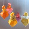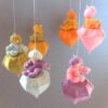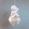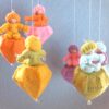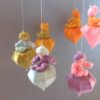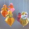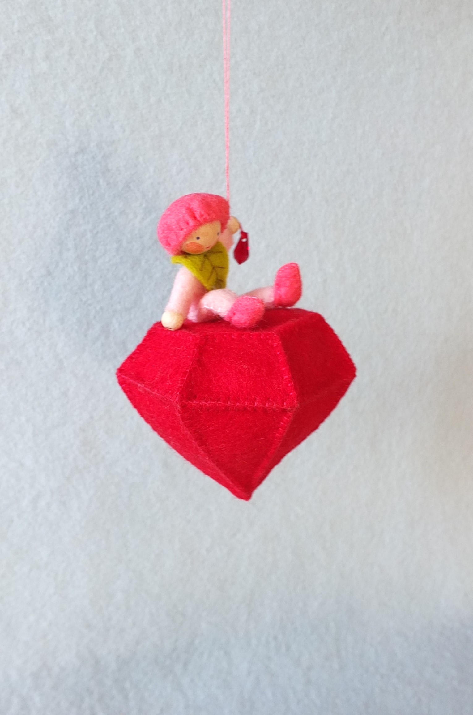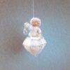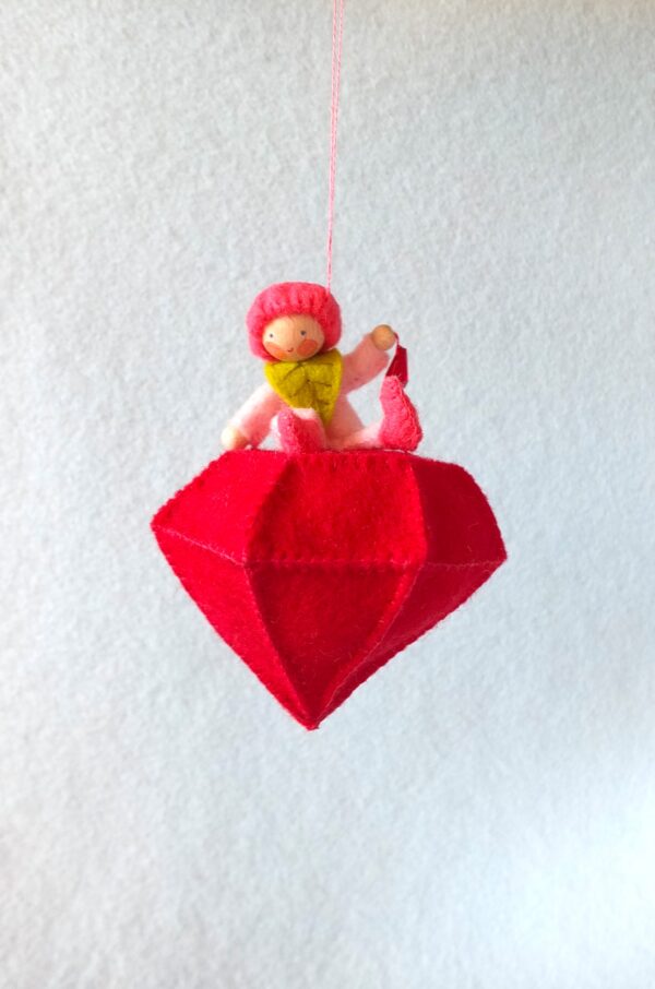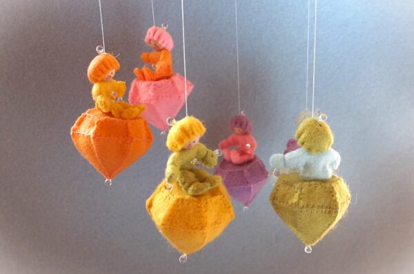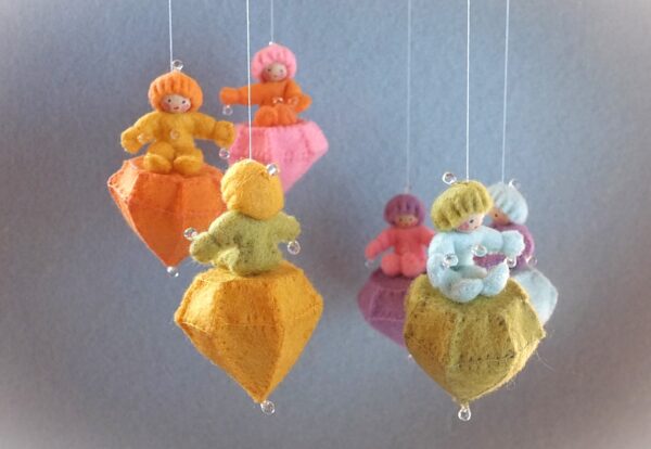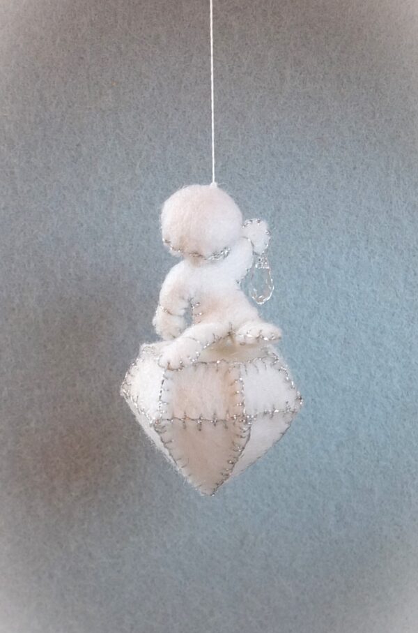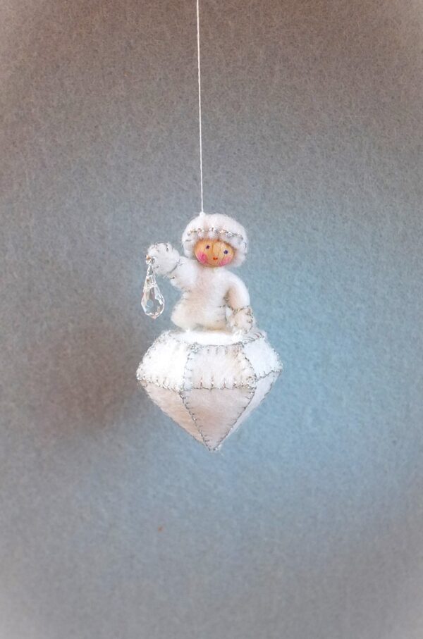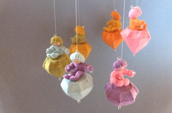 Op fonkelende kristallen in regenboogkleuren zitten lieve, kleine kristalkindjes. Ze zijn versierd met glaskraaltjes en je kunt ze in iedere houding buigen. De kristallen zijn 4 cm groot en de kindjes 5 cm. Je kunt ook een witte kristal maken en het kindje met zilverdraad naaien – dat geeft weer een heel andere uitstraling. Helemaal bijzonder wordt het wanneer je een echt klein kristalletje in een handje bevestigt.