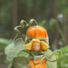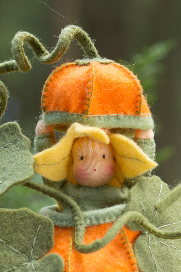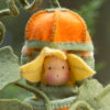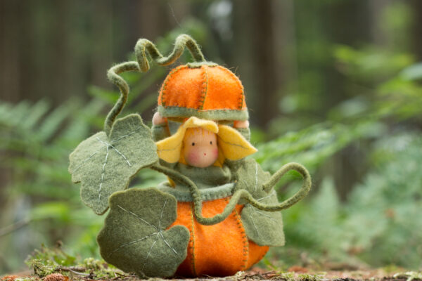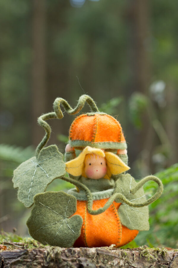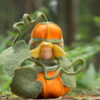 Dit leuke kindje heeft zich verstopt in een pompoen. Er slingert een tak rondom het tafereel dat ongeveer 14 cm hoog is. In deze pompoentijd is het een populair ontwerp.