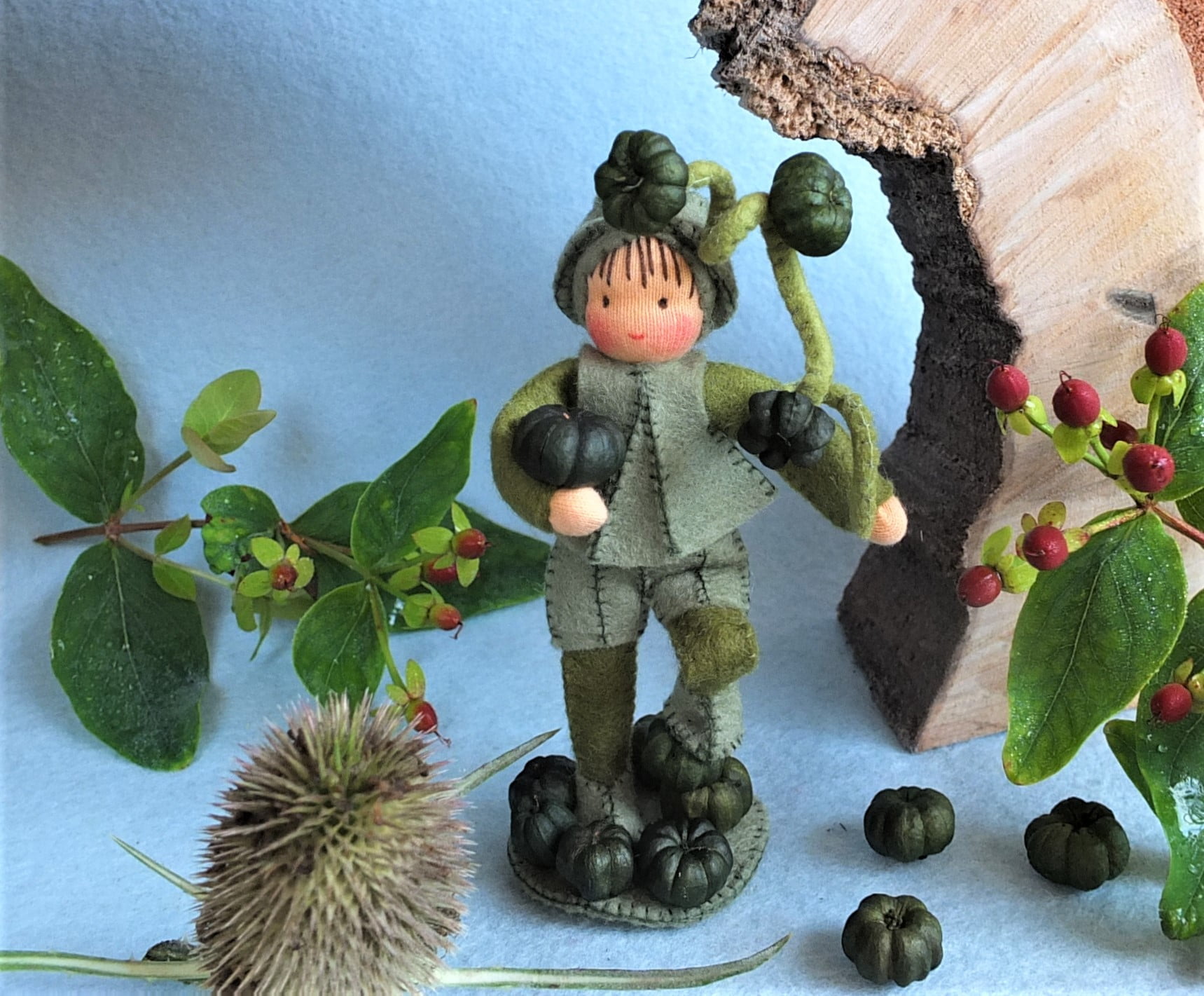 Dit is een mooi pompoenmannetje van 13 cm en gemaakt met een tricot hoofdje. Hij lijkt wel vergroeid met zijn pompoenen. De kleine pompoentjes kun je bij een tuincentrum kopen of je maakt ze zelf wat viltbolletjes. Maar je kunt ze ook vervangen door besjes of wat je maar voor leuks hebt of vindt.