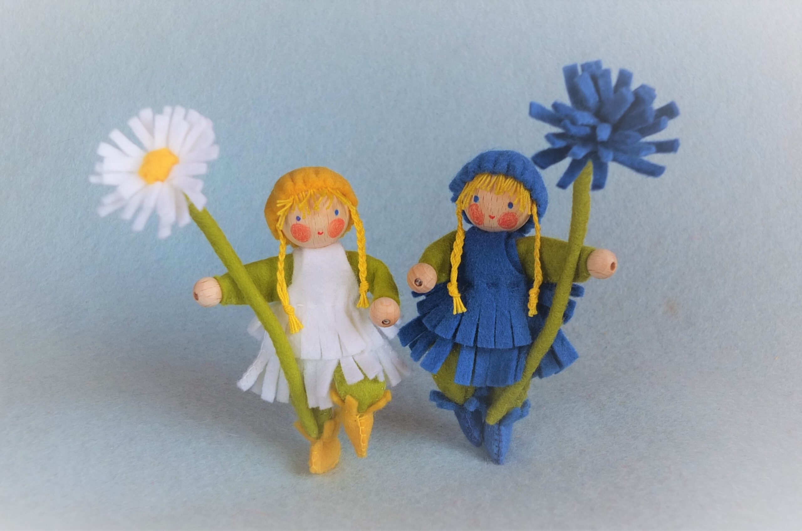 Een patroon van prachtige bloemenkinderen de korenbloem en margrietje. Ze zijn 8 cm groot zonder de bloem en horen bij een serie van 12 bloemenkinderen voor in de jaarring van Grimms.