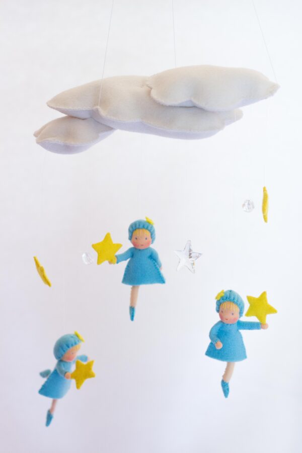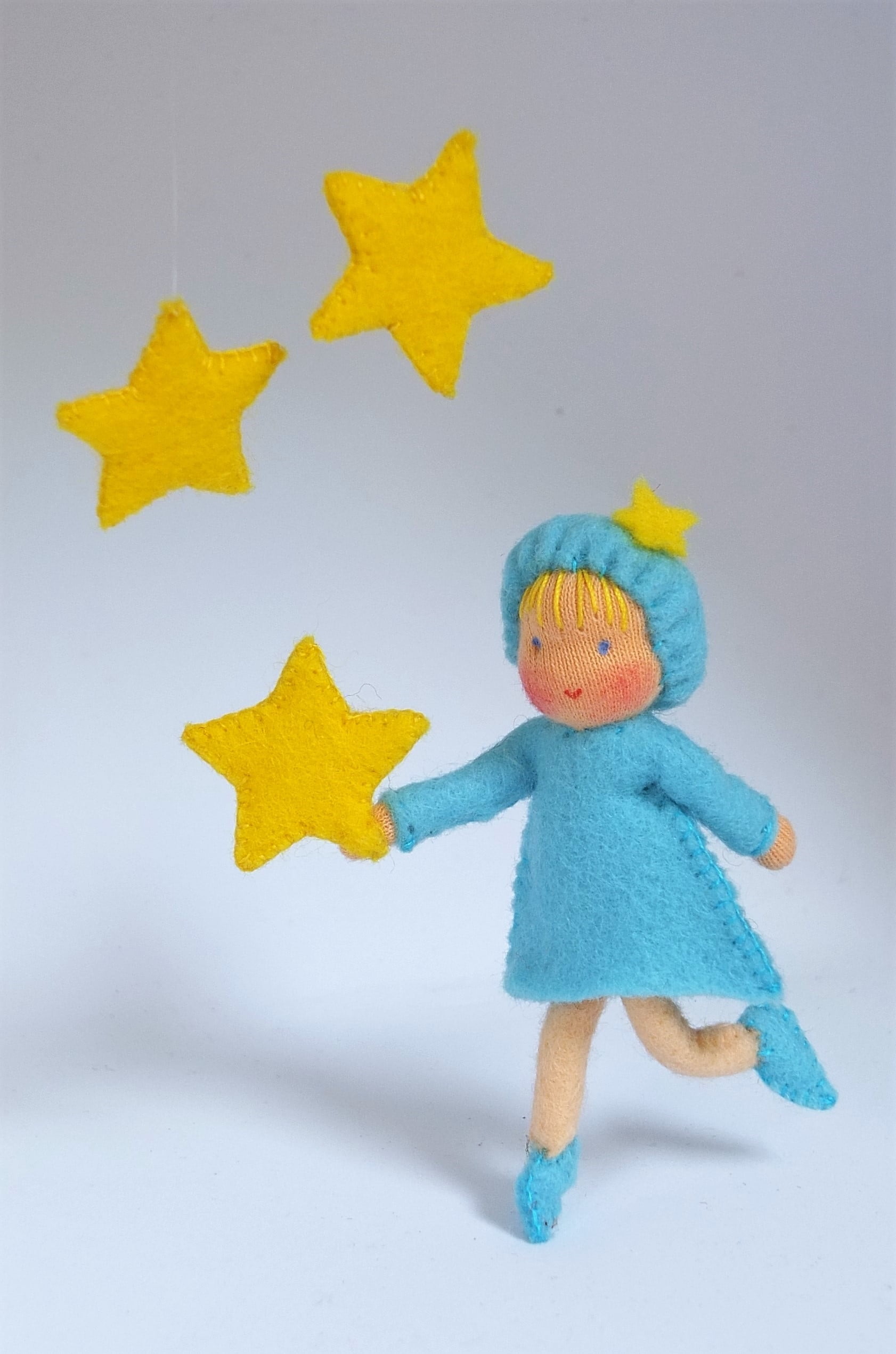 Een lief meisje (of jongetje) dat sterren vangt. Ze is ongeveer 10 cm en eenvoudig om te maken. Met wat extra sterren, kristallen en een wolk van vilt of watten kun je een prachtige blikvanger maken. Leuk voor de babykamer of boven de seizoenstafel.