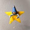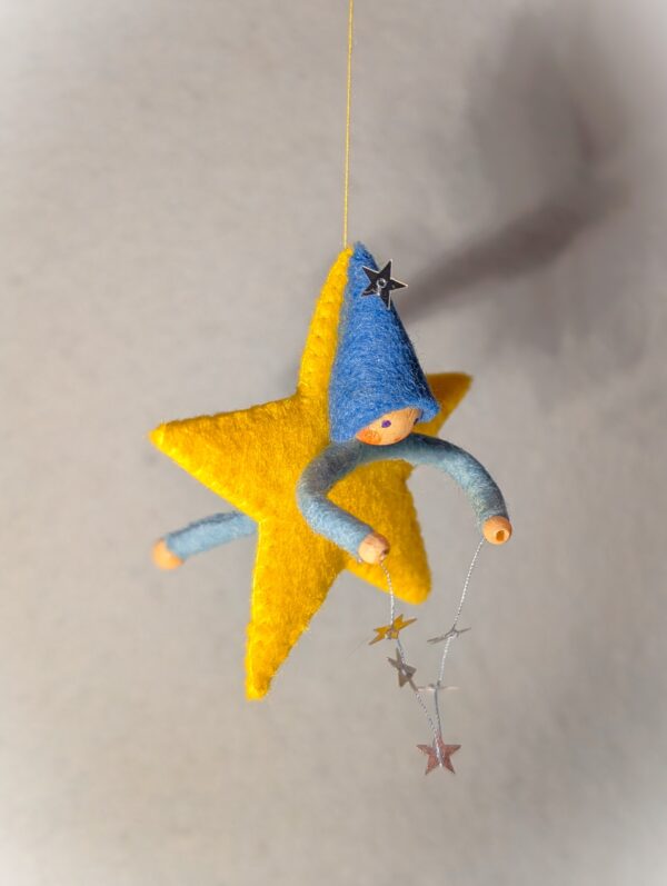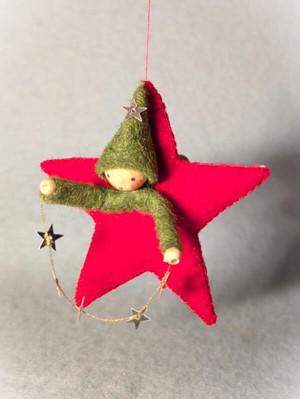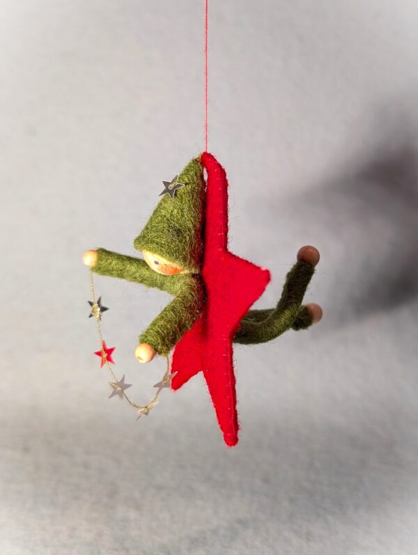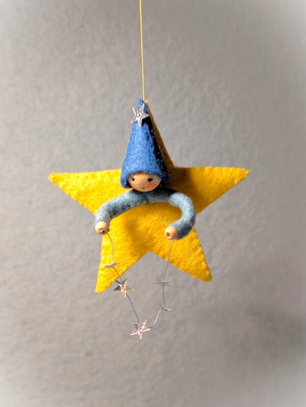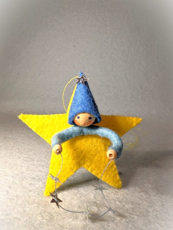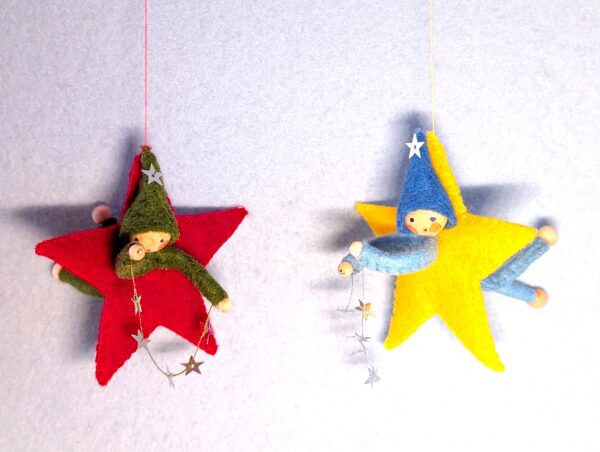 Het lieve ontwerp Sterretje van Atelier Pippilotta is een vilten ster van ongeveer 7 cm groot, met daarin een kaboutertje dat een streng van zilveren sterretjes vasthoudt. De combinatie van warme materialen en sprankelende details maakt dit ontwerp betoverend in zijn eenvoud. Sterretje is perfect om op te hangen bij de seizoenstafel in de winter, waar hij direct een feestelijke en sfeervolle uitstraling geeft. Maar ook tijdens de kerstperiode komt dit vrolijke figuurtje prachtig tot zijn recht – bijvoorbeeld als hanger in de kerstboom. Laat je fantasie vooral de vrije loop: speel met kleuren, materialen of extra details om jouw Sterretje helemaal eigen te maken. Een klein project dat groot plezier geeft!