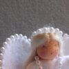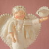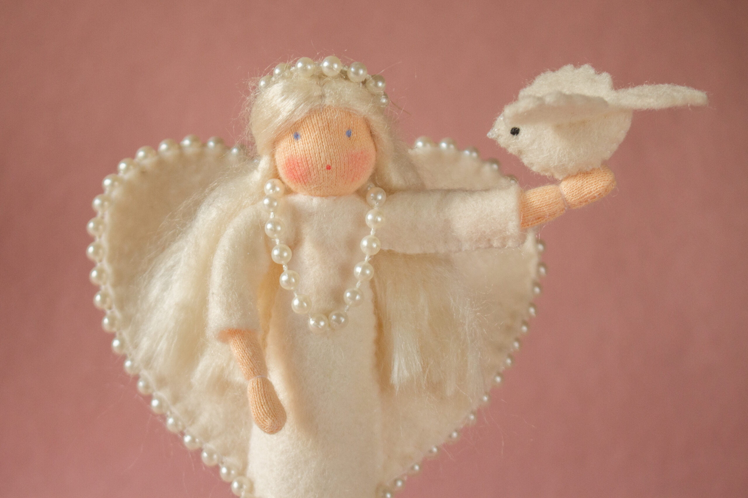 De vredesengel is 15 cm hoog en houdt een vredesduifje in haar hand. Ze is versierd met een kralenketting en haar haren zijn van zijdelont. Een prachtig ontwerp!